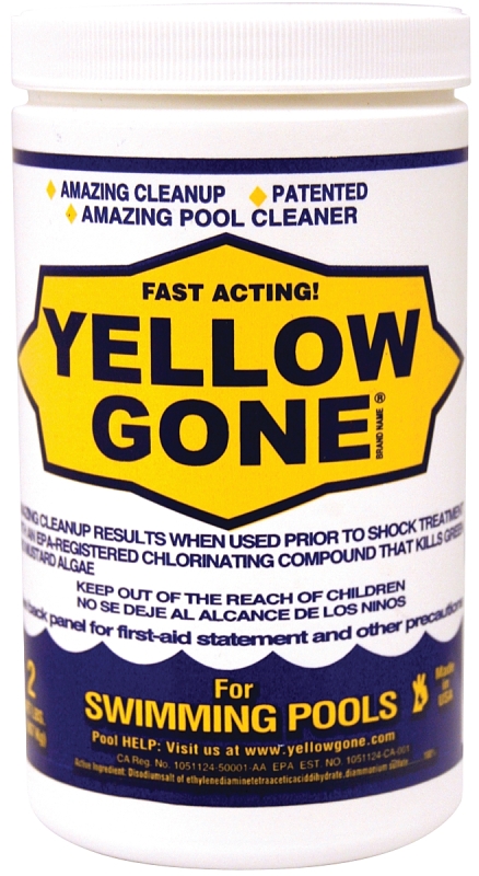Yellow gone is a chemical breakthrough. Amazing cleanup results when used prior to an EPA registered chlorine that kills, green, yellow, pink and brown algae.