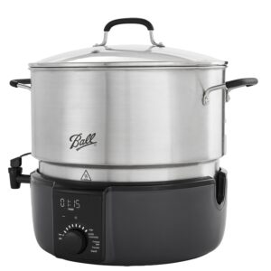 Free up time and space on the stovetop with the Ball EasyCanner. Just fill the freestanding canning pot with water and jars of your favorite canning recipes, set the timer, and relax as it takes care of the rest. The pre-programmed Press and Forget technology automates preheating and processing steps with heat sensors that maintain optimal temperatures for consistent results every time while eliminating the time-consuming need to watch the pot. The 21 qt capacity fits up to 8 pint-size or 7 quart-size jars. When finished, use the spigot for mess-free draining into your sink, and add the lid, rack, and steam tray to the dishwasher for easy cleaning; pot is hand-wash only. Comfortable handles make it easy to lift and tuck away when not in use. Plus, canner includes multi-cooker and steamer functionality that's perfect for cooking pastas, soups, vegetables and seafood, making it the essential all-in-one tool for new and experienced canners alike.Item Specifications