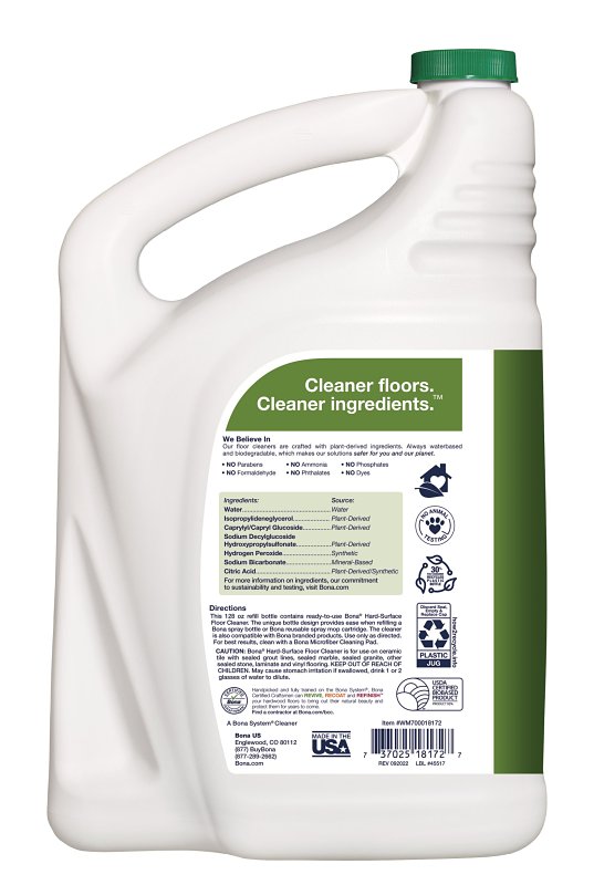 Refills your empty cartridge or spray bottle with ready-to-use hard surface floor cleaner. Splashless technology and wide handle give extra control and a smooth pour. The residue-free solution removes dirt and grime to reveal the floor's natural beauty. Bona® hard surface floor cleaner refill fills your empty Bona® cartridge or spray bottle with ready-to-use Bona® hard surface floor cleaner. The bottle has splashless technology while the wide handle allows for an easy, controllable refill experience. The rinse-free, streak-free formula cleans multi-surface floors by removing dust, dirt and grime leaving your floors clean and beautiful. Crafted with plant-derived ingredients and containing 92% USDA certified bio-based content for a more sustainable cleaning experience. Love your floors with Bona. Waterbased solutions and safer choice certification ensure a safer product for people, pets and the planet.