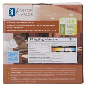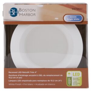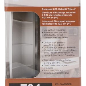Recessed baffle trim is white and features dimmable, 2700K warm white light with 600 lumens, 8.5 W. LEDs included; no bulbs to replace. Use with 4 in housing. Minimum starting temperature 0 deg F. Rated for wet location, IC Rated for direct contact with insulation. 5-year Limited warranty, cETL/ ETL/ Energy Stars Listed.Item Specifications
