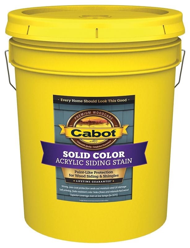 Cabot® solid color acrylic siding stain is an advanced technology, 100% acrylic solid color stain formulated to have great performance properties for the professional user. Solid color acrylic siding stain is a heavily pigmented and exceptionally thick wood siding stain, delivering greater opacity than conventional solid color stains. The result is smoother spread, better coverage and superb handling when applied by either brush or sprayer. In addition, this product has been developed and tested for use in colder temperatures, extending the exterior maintenance season for professionals in cooler climates. Cabot solid color acrylic siding stain covers previously painted or stained surfaces in just one-coat, improving project completion time and maximizing labor efficiencies. Cabot solid color acrylic siding stain is so advanced, it does not require the use of a primer coat on non-extractive-prone wood species such as pine, white cedar or cypress.Item Specifications