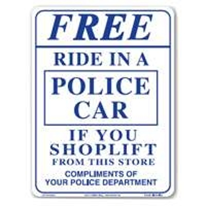 Durable plastic shoplifting signs will help stop shoplifters in their tracks. Signs offer serious warnings in lighthearted language, help deter would-be shoplifters from stealing valuable merchandise. Sign Smile says Smile You're on Camera and Sign Ride says Free Ride in a Police Car.