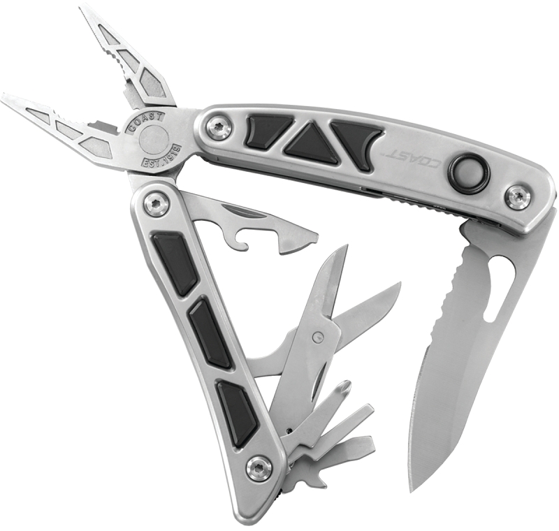 With two built-in LED lights to illuminate work surfaces, the multi-tool is ideal for working on the car, under the sink or other tight spaces where light is needed. Sure grip rubber handle inlays provide a firm and comfortable grip. Stainless steel construction ensures that this tool will provide years of worry-free use. Spring-loaded pliers head for easy one-handed operation. Includes scissors, bottle cap lifter, small and medium slotted screwdriver tips and Phillips screwdriver tip. LEDs take two CR1616 batteries (included).Item Specifications