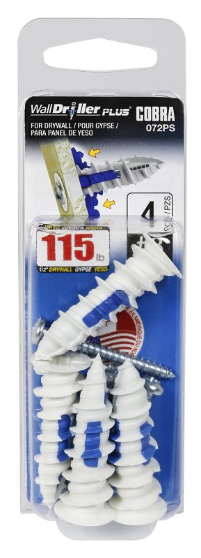 The WallDriller PLUS®, 2X stronger than our 1st generation, is designed with three expandable legs that grip tightly behind the drywall for maximum holding power. Its fine-centered point helps guide the anchor into the wall with flawless precision. A sharp profile thread cuts deeply into the hole without damaging the drywall, ensuring excellent holding power and stability. The sharp cutting edge reduces the force required to cut the material, making it a self-drilling anchor without pre-drilling. Available sizes - #6 (3.5 mm), #8 (4 mm), #10 (5 mm) and #12 (6 mm).Item Specifications