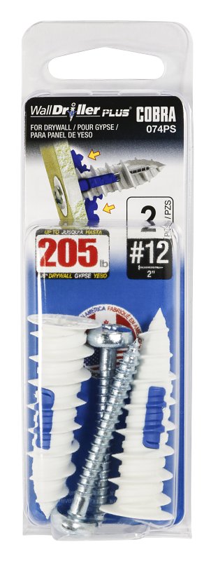The WallDriller PLUS®, 2X stronger than our 1st generation, is designed with three expandable legs that grip tightly behind the drywall for maximum holding power. Its fine-centered point helps guide the anchor into the wall with flawless precision. A sharp profile thread cuts deeply into the hole without damaging the drywall, ensuring excellent holding power and stability. The sharp cutting edge reduces the force required to cut the material, making it a self-drilling anchor without pre-drilling. Available sizes - #6 (3.5 mm), #8 (4 mm), #10 (5 mm) and #12 (6 mm).Item Specifications