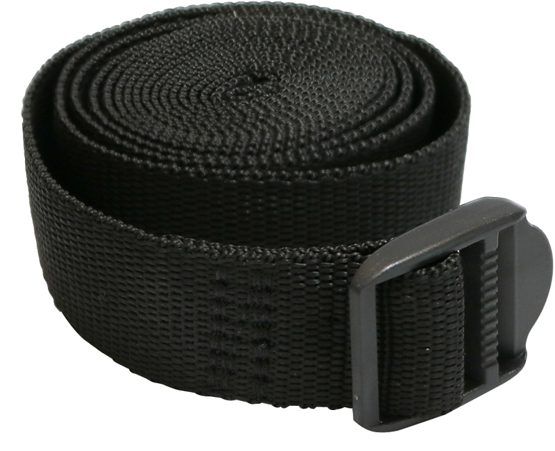 Strong 1 in polypropylene strap. Sewn on buckle. Easy to cut and seal to desired length.