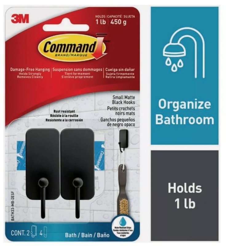 Command Small Bath Hook, 1 lb Weight, Number of Hooks: 2, Metal, Matte Black, Includes: (2) Hooks and (4) StripsItem Specifications
