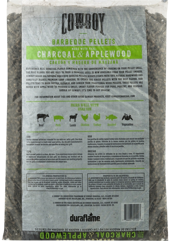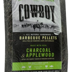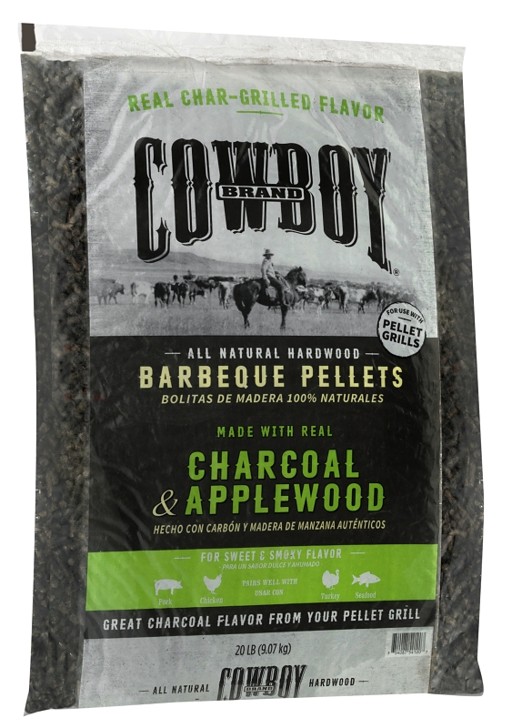 Cowboy® charcoal and apple barbeque pellets are made with all-natural apple wood and all-natural hardwood charcoal, with no additives. The addition of natural charcoal to the pellet adds an authentic char-grilled flavor to your foods. For a bold and hearty flavor, use charcoal and hickory barbeque pellets to cook pork, chicken, turkey and seafood.Item Specifications