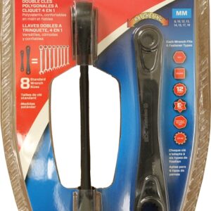 Innovative stepped box ends deliver access and clearance, 5 deg ratcheting arc provides great access to fasteners. fits 6 fastener types hex, square, 12 pt, "E-Torx", rounded hex and spline. Smooth profile allows for more torque to be comfortably applied to the fastener. Each wrench is capable of 4 sizes 8 mm, 10 mm, 12 mm, 13 mm and 14 mm, 15 mm, 17 mm and 19 mm for a total of 8 sizes in just 2 wrenches.Item Specifications