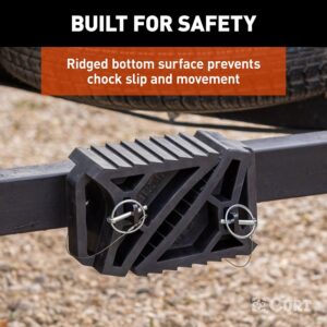 Curt HD wheel chocks are the ideal accessory for saving space and staying safe. These unique wheel chocks mount to the trailer frame and prevent the need to store them inside your truck or RV. The unique bracket mounts to the trailer frame and includes snap-rings which quickly store your wheel chocks out of the way and outside of your vehicle. No more dirty wheel chocks inside your truck or SUV. These HD wheel chocks are made from heavy-duty materials and prevent trailer or vehicle movement. The dense rubber construction provides improved traction to prevent chock slippage or movement and the high-density steel brackets avoids bending or breaking with use. Finished with a weather resistant liquid A-coat that prevents rusting and corrosion and a bold orange powder-coat for durability. The kit includes self-tapping screws for mounting the included bracket to the trailer frame and prevents the need for pre-drilling holes for ease of installation. The snap-ring clips stow- away the wheel chocks and prevent loss of pieces when not in use. Quickly and easily install the bracket and go and store your wheel chocks on your trailer without losing pieces or getting dirty.Item Specifications