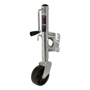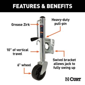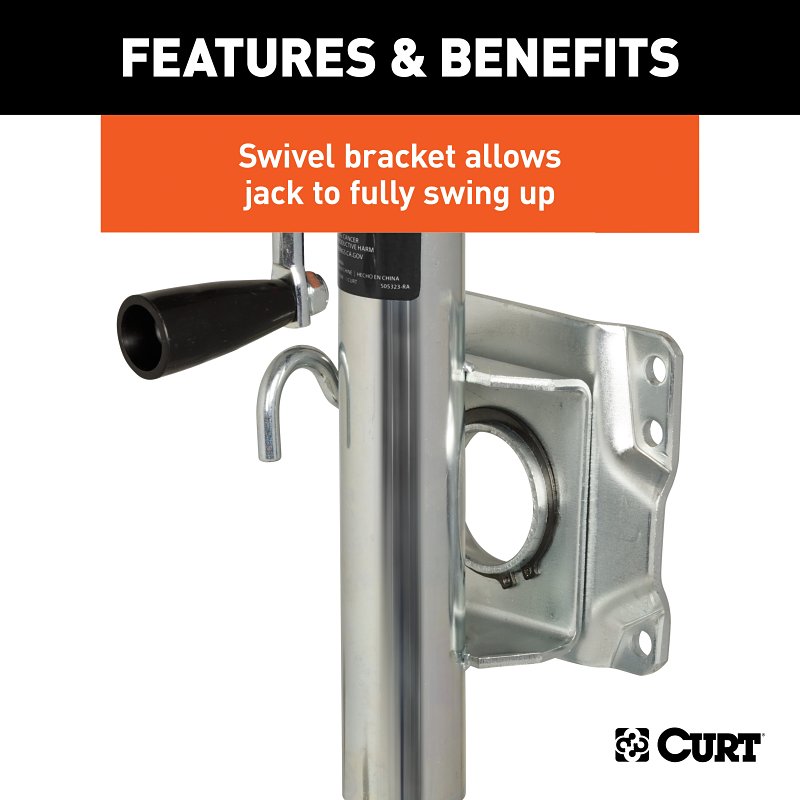In our goal of being your excellent source for all things towing, the Curt line of trailer jacks is designed with care and manufactured with pride. Curt jacks are made with quality to promote the life and function of your trailer and they come in several different styles to accommodate your needs, whether you are a frequenter of the boat landing, the campground, the racetrack or the field. Designed to withstand the wear and tear of frequent water exposure, Curt marine jacks are the jack of choice for the avid fisherman or boating enthusiast. Our marine jacks have a few features that make them a special addition to our trailer jack line. Unlike any of our other jacks, Curt marine trailer jacks are equipped with wheels, allowing for greater mobility and easier coupling of your trailer. Choose from models with one or two wheels. Marine jacks also have a heavy-duty pull-pin that allows them to pivot on their mounting bracket to be out of the way for travel. To protect them from corrosion and the damage of moisture, these jacks come with a zinc finish.Item Specifications