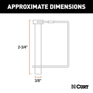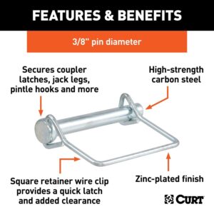 Curt safety pins go beyond the simple function of keeping your coupler latch secure. They are constructed from quality materials and have a universal design that allows them be used for a variety of purposes in your towing setup. Curt safety pins are made from solid steel to provide more than enough strength to keep your trailer coupler latched down tight. The zinc plating that we use to finish our safety pins offers excellent protection against rust and corrosion. This is necessary for any trailer because of its frequent exposure to the elements. The user-friendly design of our safety pins allows them to be easily handled while maintaining effective security. This safety pin has a pin Dia of 3/8 in. Curt safety pins can also be purchased with a 12 in chain attachment to mount onto your trailer coupler and prevent the safety pin from being misplaced. Use Curt safety pins for securing trailer couplers, jacks, caster wheels and more. When you couple your trailer to your vehicle, nuts and bolts just do not cut it. Secure your towing equipment right with a safety pin from Curt.Item Specifications