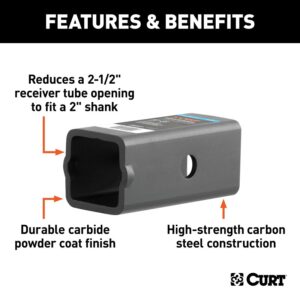 Curt hitch adapters can be used for many different purposes when hitching up a trailer. Whether a ball mount shank is too small or too large to fit into a receiver tube, a Curt adapter can make up the difference. Our adapters are built with exceptional strength and designed to be precisely fitted for their application. We carry trailer hitch adapters to accommodate both receiver tube openings and shanks of 1-1/4 in, 2 in and 2-1/2 in dimensions. Curt adapters also come in various lengths to allow more clearance for a cargo carrier, bike rake or spare tire. This Curt reducer sleeve adapter converts a 2-1/2 x 2-1/2 in receiver tube opening to a 2 x 2 in opening. It installs easily and is compatible with virtually any 2-1/2 x 2-1/2 in hitch. Its gross trailer weight capacity and tongue weight capacity are limited to the hitch. All Curt adapters are constructed using our quality manufacturing processes. We CNC-form each unit, weld it together using advanced robotic systems and then mechanically descale every surface to make each adapter smooth to accept a finishing coat. To finish off this adapter, we give it a durable black carbide powder coat finish to ensure it has excellent rust, chip and UV resistance.Item Specifications