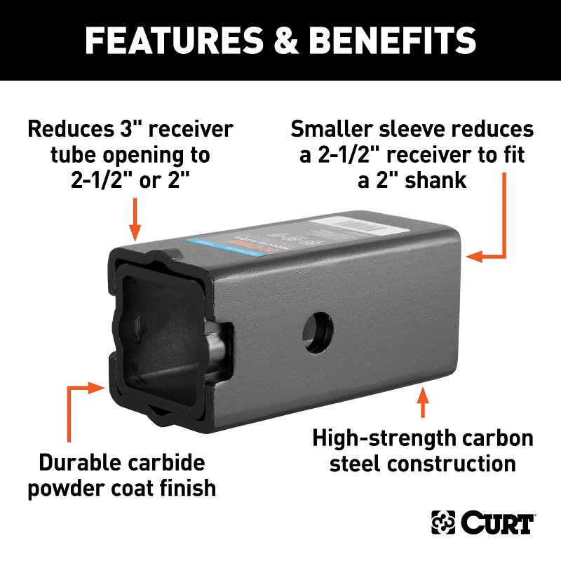 Adapting a heavy-duty 3 in receiver hitch to fit your 2-1/2 in and 2 in accessories is fast and simple with the Curt reducer sleeve set. This set includes two sleeves a larger unit for 3 in receiver tube openings and a smaller unit for 2-1/2 in receiver tube openings. The set can be used together to allow a 3 in receiver to accept a 2 in shank on various accessories, such as a ball mount, bike rack or cargo carrier. The set can also be used individually. The larger unit can be used to mount accessories with a 2-1/2 in shank on a 3 in receiver and the smaller to be used in a 2-1/2 in receiver to accept accessories with a 2 in shank. Both reducer sleeves in the set are constructed from high-strength carbon steel and are finished in a rust-resistant carbide black powder coat finish. The weight ratings of the reducer sleeves are limited to the weight ratings of the hitch.