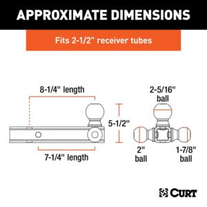 If you own more than one trailer, you know what a hassle it can be switching back and forth between ball-mounts and keeping track of which ball-mount fits which coupler. Curt has made things simpler with the multi-tow ball-mount. These ball-mounts feature two or three trailer balls-mounted onto a straight shank to accommodate various coupler sizes and loads. This multi-ball ball-mount features a 1-7/8 in, a 2 in and a 2-5/16 in ball. The 1-7/8 in trailer ball can tow up 5000 lb of gross trailer weight and 500 lb of tongue weight. The 2 in ball can handle 10000 lb of GTW and 1000 lb of TW and the 2-5/16 in ball accepts loads up to 14,000 lb with 1400 lb of TW. This multipurpose ball-mount also features a dual length option and has a hollow shank to accept an anti-rattle kit. All of our multi-use ball-mounts come with a gloss black powder-coat finish and a 2-1/2 x 2-1/2 in shank. Curt multi-tow ball-mounts are an obvious choice for anyone who tows more than one trailer on a regular basis. The multiple-ball design allows for quick changes between ball sizes without needing to install or own an entirely different ball-mount. Because the balls are permanently welded to the shank, these ball-mounts are also very secure, eliminating the possibility of a ball coming loose and deterring any potential theft.Item Specifications