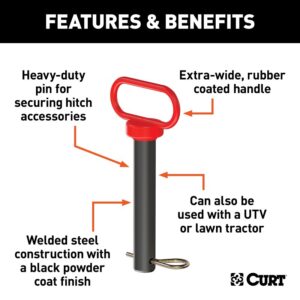 This Curt clevis pin is a versatile towing accessory, providing a fast and easy to use way to secure a ball mount or other receiver hitch accessory. It can also be used as a coupling pin when towing with an ATV, UTV or lawn tractor. This clevis pin with handle features a high-strength steel construction for dependable towing power and it has a durable black powder-coat finish to ensure long-lasting resistance to the elements. The pin has a diameter of 1 in and measures 5-1/2 in long.Item Specifications