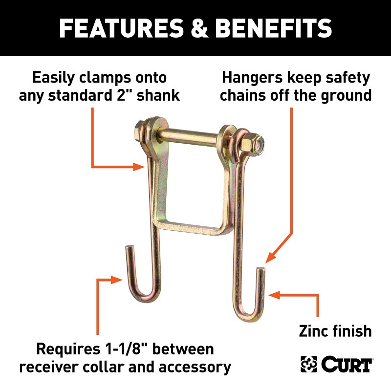 This simple bracket makes it easy-to keep your trailer safety chains from dragging on the ground while towing. The bracket securely bolts onto virtually any 2 in x 2 in shank and features two wire hooks that provide a convenient, intermediate hanger point for the safety chains. This keeps the chains protected from scraping on the ground and promotes longevity. Installing this safety chain bracket is easy and secure. It clamps onto virtually any standard 2 in ball mount shank, as long as the shank has 5/8 in of clearance between the mount and the hitch receiver. Unlike other chain hanger options, the bracket is designed to bolt into place, keeping it firmly mounted even after you uncouple your trailer no separate piece that can be dropped, lost or stolen. Curt trailer safety chain hanger hooks are constructed from steel and have a zinc finish for corrosion-resistance.Item Specifications