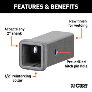 For the do-it-yourselfer, Curt offers an entire line of towing fabrication components to supply you with the quality building blocks you need. These raw steel components are made from solid steel for maximum strength and they come ready to be welded together in whatever form you need to get the job done. Curt fabrication steel receiver tubing can be used to extend the reach of your receiver or to create a piece of custom towing equipment. Each unit is equipped with a 1/2 in reinforcing collar for extra strength and has a raw finish to be ready for welding. This receiver tube has a 2 x 2 in opening and measures 6 in length.MORE DETAILS: