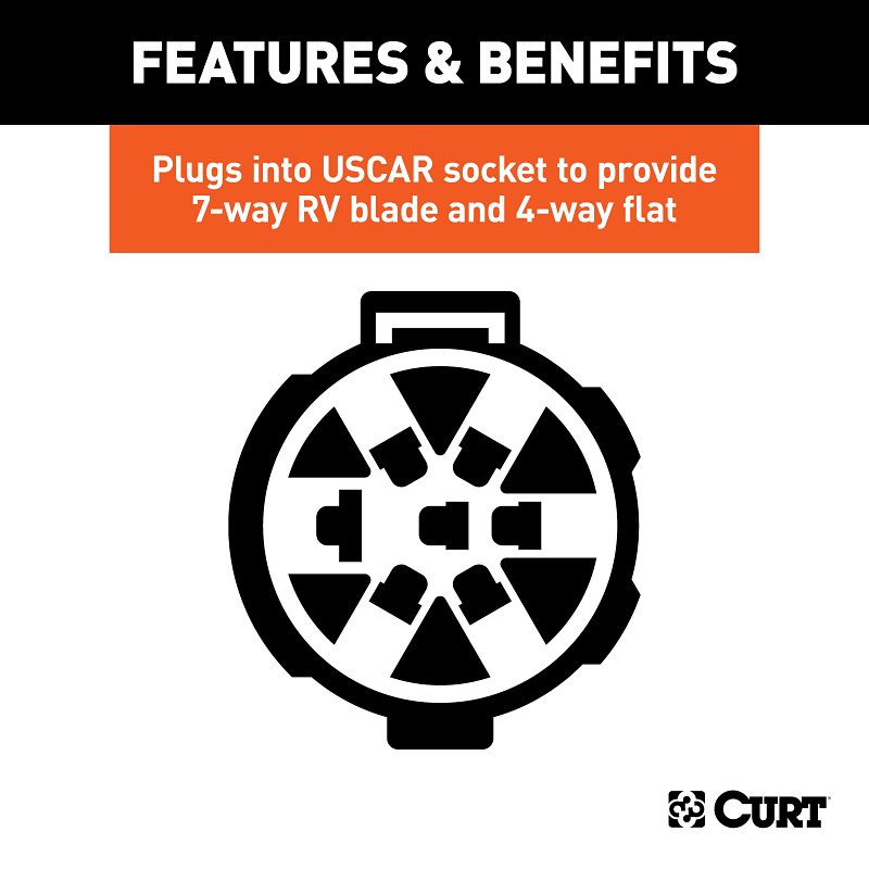 A Curt custom wiring connector (sometimes called a T-connector) is a simple, plug and play electrical device that eliminates the need for cutting, splicing and soldering when installing vehicle to trailer wiring. Most vehicles do not come ready to tow. Unless your vehicle has a towing package, it is probably not equipped with a trailer wiring connector. This is where Curt's custom wiring connectors come into play. A custom wiring connector uses a single original equipment plug to plug into a special socket provided by your vehicle. Though this option is not available on every vehicle, some automotive manufacturers design their vehicles to be easily equipped for towing by supplying a socket, integrated into the vehicle's electrical system, to readily accept a custom wiring connector. With a Curt custom wiring connector, there is no need to tap into the taillight assembly because a special socket is already provided. This special custom wiring connector actually provides two connector sockets for a multipurpose option. It plugs into an OEM USCAR connector and offers a four-way flat and six-way round connector (see application info to verify fitment with your vehicle). It also comes with a mounting bracket for easy installation. Curt custom wiring connectors are designed to be long-lasting and simple to install. They come with dust covers to keep your connector clean when not in use.Item Specifications