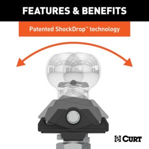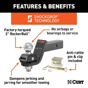 The Curt RockerBall⢠cushion hitch provides improved comfort and enhanced control while towing, featuring our unique ShockDrop⢠technology. An integrated cushion isolator allows the hitch ball to turn the standard ball mount into a cushion hitch with anti-rattle capabilities. The RockerBall⢠ball mount kit is a shock-absorbing hitch accessory that dynamically reduces jerking and jarring while towing. As your trailer passes over bumps and potholes, it produces all kinds of vibrations, jolting, chucking and noise. With a traditional metal-on-metal connection, these annoyances are directly transferred to your tow vehicle, making your ride noisy, uncomfortable and taking a toll on your towing system. The RockerBall⢠completely changes your towing experience by absorbing the erratic movement and rattling of your trailer at the coupling point. This provides a smoother ride and increased control over the vehicle and trailer. It also reduces the amount stress placed on your vehicle, receiver hitch, brakes and suspension system. The RockerBall⢠is also extremely low maintenance compared to other torsion hitch and cushion hitch options. It has no airbags or bearings to service. Simply apply grease to the integrated zerk fitting as needed for continuous lubrication and smooth operation. This RockerBall⢠hitch kit comes with a standard ball mount with a 3 in drop and standard 2 in shank to fit most class 3, class 4 and class 5 receiver hitches. It also includes an anti-rattle shim kit for maximum vibration-resistance. The Curt RockerBall⢠hitch ball is constructed from forged steel for exceptional strength. The base and ball mount are covered in a durable powder-coat finish, and the ball itself has a chrome plating for long-lasting weather-resistance.Item Specifications