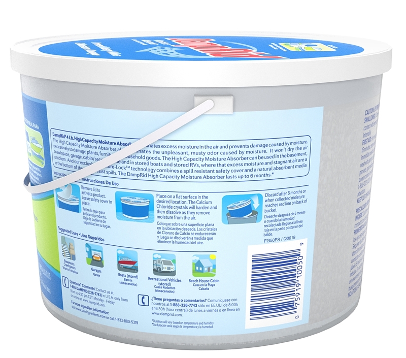 DampRid High-Capacity Moisture Absorber, 2 lb Net Content, Tub Container, Solid Form, Off-White/White, Compositions: Calcium Chloride, Sodium Chloride, Potassium Chloride, 2.15 Specific Gravity, 1000 sq-ft Coverage Area, Melting Point: 369 to 1420 deg F, 350 to 3500 deg F Boiling Point, 15.4 lb/gal DensityItem Specifications