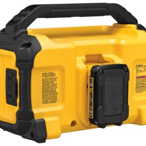 This BLUETOOTH speaker is jobsite tough and produces high-quality sound. Enhance your workday by streaming your favorite music or podcasts from your Bluetooth equipped mobile device from up to 100 ft away. You can also plug devices directly in with the auxiliary input. Charge your phone through the day with an integrated USB charging port. Stand your mobile phone in the slot of the built-in carry handle or underneath. Enjoy rich stereo sound with extended bass from dual 3 in speakers. Its rugged design includes a metal grille and impact-resistant housing. Power the jobsite Bluetooth speaker with DeWALT 12 V MAX, 20 V MAX or FLEXVOLT batteries, all sold separately. Includes universal AC cord.