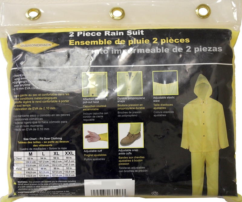 Diamondback Rain Suit, 2XL, Fits to Chest Size: 58 in, Fits to Waist Size: 52 in, EVA, Yellow, Collar Type: Hooded, Sleeve Type: Adjustable Cuffs, Cuff Type: Adjustable, Seam Type: Heal Sealed, Snap Down Storm Flap Closure, Length Type: Over-Waist, Inseam Length: 44 in, 34 in L, Resists: Water, Includes: Grommeted PVC Bag, InsertItem Specifications