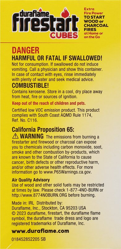 Extra fire power to start wood or charcoal fires at home or on-the-go. Duraflame® fire start® cube give you the fire power you need to start wood or charcoal fires at home or on-the-go. Fire start® cubes maintain a long-burning, consistent flame to help you get a quick and easy start to your fires.Item Specifications
