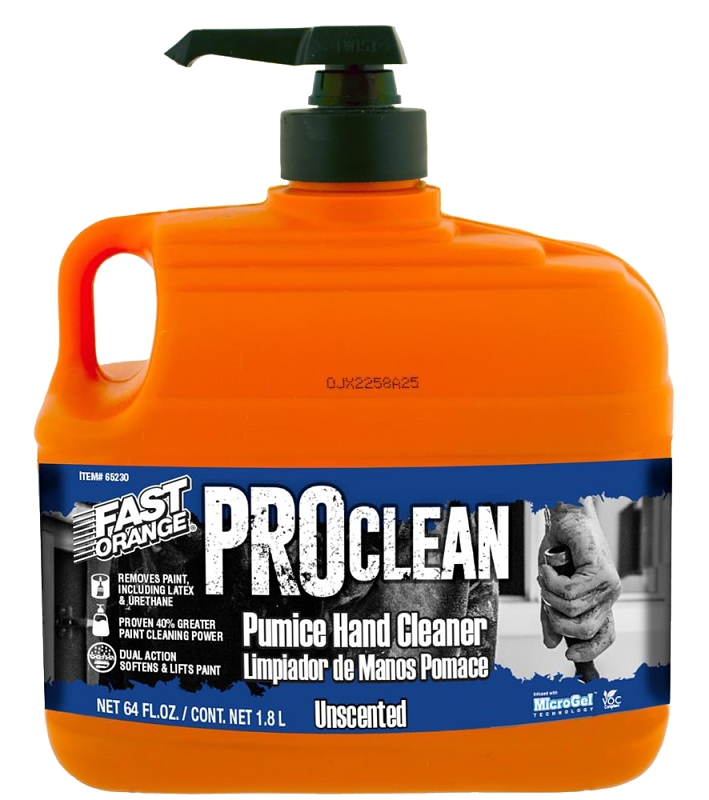 Fast Orange® PROClean hand cleaner is designed with one unique goal in mind, remove troublesome paint stains and messes from skin. The dual-action formula uses pumice which gets into all the creases to break down latex and urethane paints while the patented Microgel drills deep into the stain to effortlessly release it from skin. Fast Orange® premium skin conditioners including lanolin, aloevera and jojoba moisturize dry, cracked hands.Item Specifications