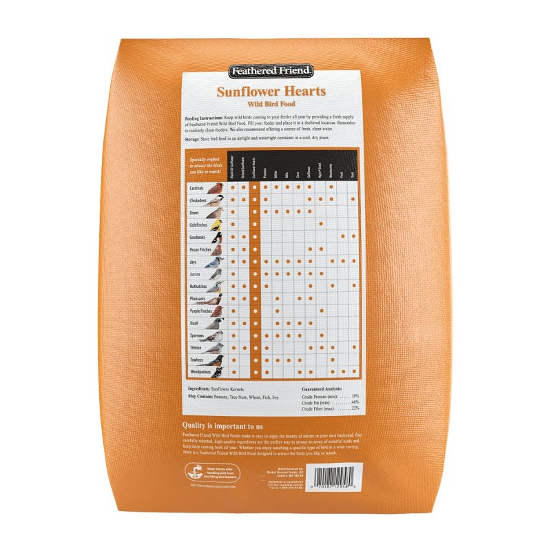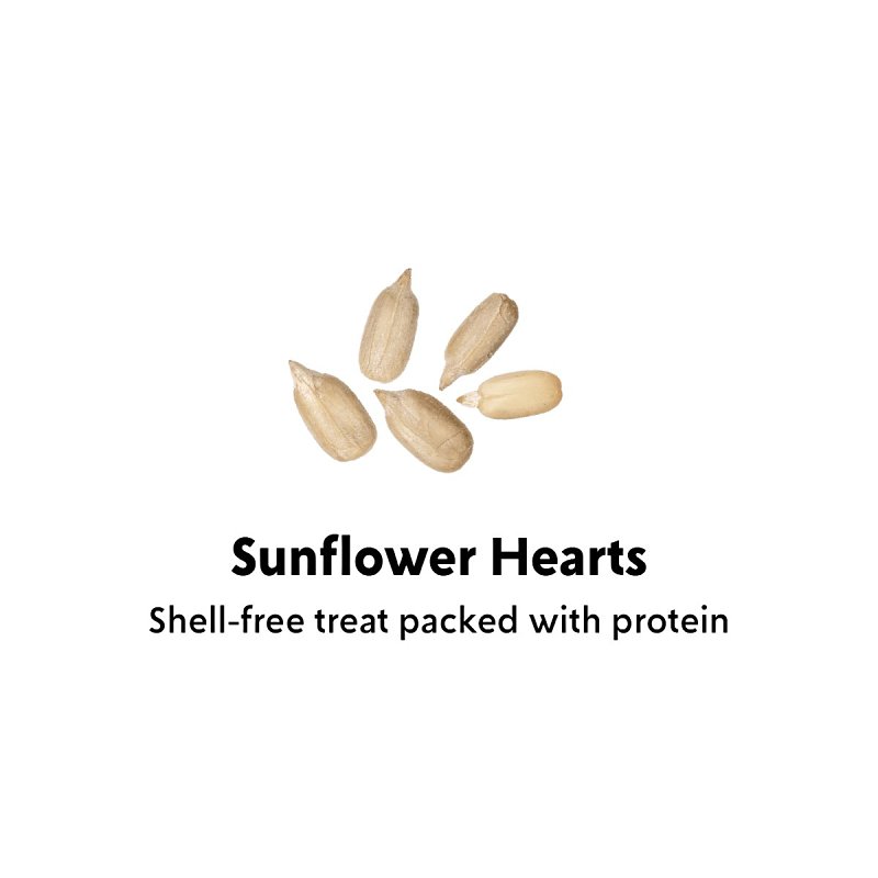 Feathered Friend sunflower hearts wild bird food is a popular shell-free treat loved by all seed-eating birds. This premium mix of whole sunflower hearts and finely chopped sunflower pieces is rich in healthy fat and protein - and contains zero shells for less mess.