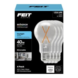 Enjoy classic style and modern reliability and energy savings, with the Feit Electric A1940CL950CA/FIL/4 four-pack of LED light bulbs. These beautiful high-performance bulbs combine innovative LED technology with filament strips, saving energy while providing the look of a traditional bulb. Each bulb outputs 450 lumens of light while using only 5W - a saving of up to 87.5% in energy costs over an equivalent 40W incandescent. 5000K Daylight White color temperature is ideal in kitchens, offices and anywhere you need energizing light for seeing things in fine detail. High 90+ CRI that makes colors more vivid and natural, all while conserving energy and lasting for decades. These bulbs last up to 15,000 hr/13.7 years. Their estimated annual energy cost is only $0.60. The versatile A19s are fully dimmable and suitable for a variety of general purpose lighting applications.Item Specifications