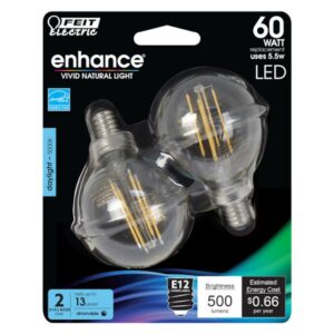Feit Electric LED Light Bulb, Globe, Wattage Rating: 5.5 W, Lamp Base: E12, Lamp Shape: G16, Lumens: 500 Lumens, Dimmable: Dimmable, Color Temperature: 5000 K, Color Rendering Index (CRI): 95, Average Life: 15,000 hr, Dimensions: 50.3 mm Dia x 82.8 mm LItem Specifications