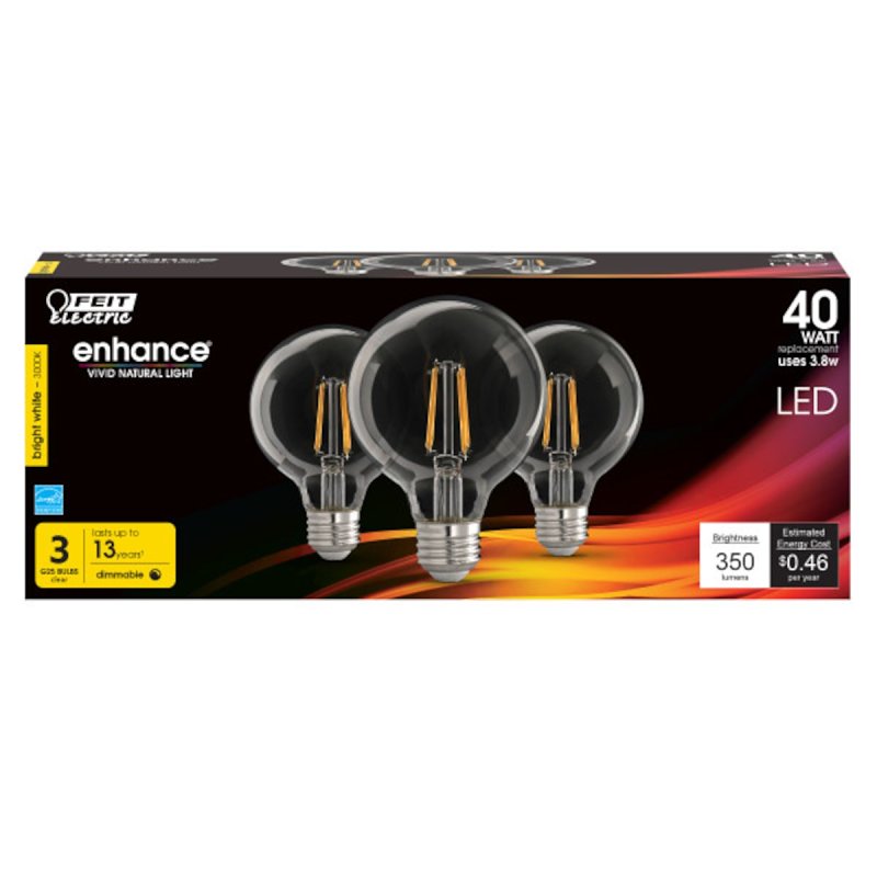 Combine the vintage glass filament lighting look and feel with the advantages of modern LED technology with these stylish light bulbs from Feit Electric. Energy-efficient LEDs replace a 40 W incandescent, producing a 3000 K bright white glow that gives homes a cozy feel. A G25 globe design with exposed filament wrapped in clear glass housing is ideal for chandelier fixtures and will enhance the decor of any room. Enhance 90+ CRI light makes colors vibrant and skin tones more natures, all while saving energy and lasting for decades.Item Specifications