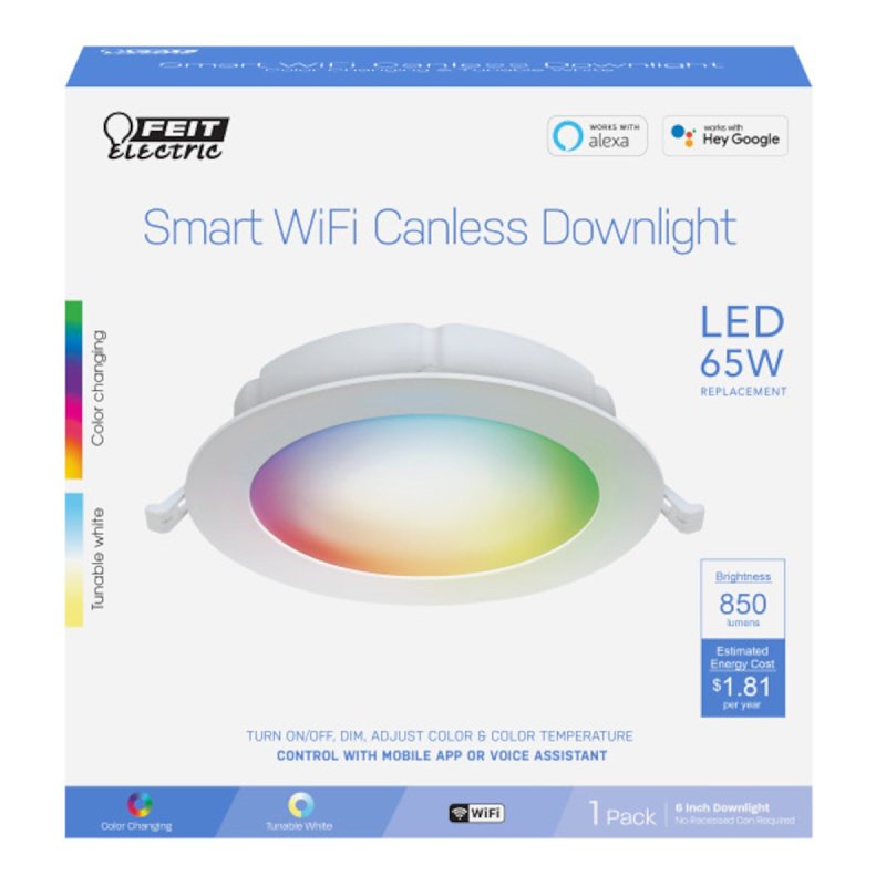 Convert your old recessed downlights to advanced LED energy-saving technology with the LEDR6XT/RGBW/CA/AG 6 in smart downlight from Feit Electric. This innovative downlight comes with a tethered J-box and built-in trim for installation directly into finished ceilings without recessed cans. Use your favorite mobile device or Alexa/Hey Google smart assistants to easily turn lights on/off, dim, set groups and schedules from anywhere. Choose energizing daylight or wind down with relaxing soft white light. Get creative with color, it's all up to you. Control lighting with simple voice commands or an intuitive mobile app. Setup is simple: the lights connect directly to your Wi-Fi at home and can be controlled from anywhere. A 90+ CRI makes colors vibrant and skin tones look more natural, all while saving energy and lasting for decades.Item Specifications