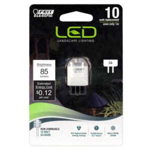 Enjoy all the benefits of advanced LED energy-saving technology with the Feit Electric LVG410/LED 10 W wedge G4 LED light bulb. This 3000 K warm white light is non-dimmable and will replace a 10 W equivalent incandescent bulb. It produces a similar light output (85 lumens), uses 1 W of energy and up to 90% less energy than a standard incandescent light bulb. Get instant on to full brightness with relatively cool running performance. Feit Electric wedge bulbs have an average life of 15,000 hr/13.7 years are RoHS compliant and are 100% mercury-free. Choose a dependable low voltage LED landscape light for residential or commercial applications.Item Specifications
