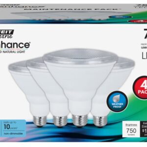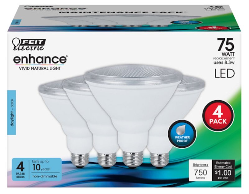 Enjoy all the benefits of advanced LED energy saving technology with Feit Electric PAR38/950CA10K/MP/4 multipack PAR38 75 W high-CRI LED light bulbs. This non-dimmable 5000 K daylight white LED will replace a 75 W incandescent bulb. It produces a similar light output of 750 Lumens using only 8.3 W of electricity - up to 89% less than a standard incandescent light bulb. These PAR38 bulbs have an average life of 11000 hr/10 years are RoHS compliant and 100% mercury-free. A 90+ CRI rating makes colors more vibrant and skin tones look more natural, all while saving energy and lasting for a decade or more.