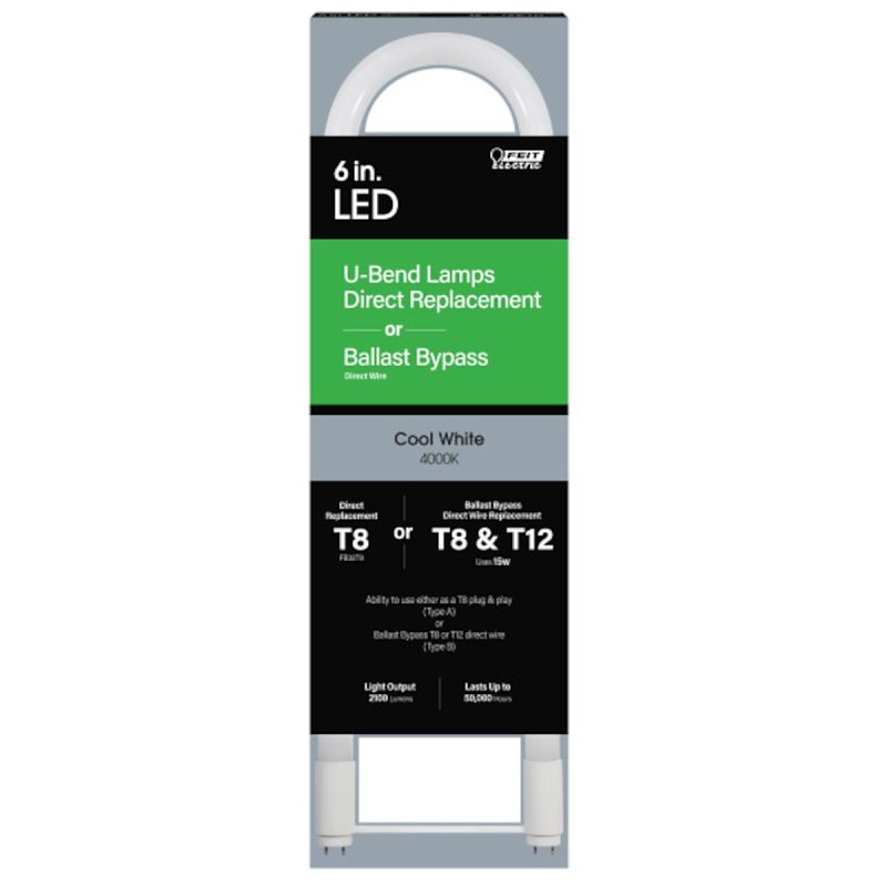 Convert your existing fluorescent fixture to LED technology with the Feit Electric T848/840/AB/U6/LED 6 in. T8/T12 U-bend LED lamp. These non-dimmable 4100 K cool white lights produce a similar fluorescent light output of 2100 lumens while using only 15 W up to 53% less energy. Feit Electric shatter-resistant T8 / T12 bulbs have an average life of 50000 hr / 45.7 years, are RoHS compliant and 100% mercury-free. These versatile bulbs can be used either as a plug and play replacements using existing ballast or can operate without a ballast after basic rewiring of the fixture.