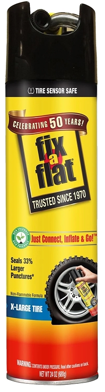 Fix-a-Flat aerosol tire inflators are the easiest and quickest way to repair a flat tire in an emergency. Fix-a-Flat is designed to seal small tire punctures in seconds and provide enough inflation to lift the rim off the ground. Fix-a-Flat seals 33% larger punctures than other tire repair aerosols and has been trusted for 50 years as an easy-to-use, better alternative to the spare tire. With its eco-friendly formula, Fix-a-Flat is safe for the user, the tire and the environment. Fix-a-Flat has a new look! The plastic cap has been tossed and replaced with a modern performance top, making Fix-a-Flat even more eco-friendly and easier to use.MORE DETAILS: