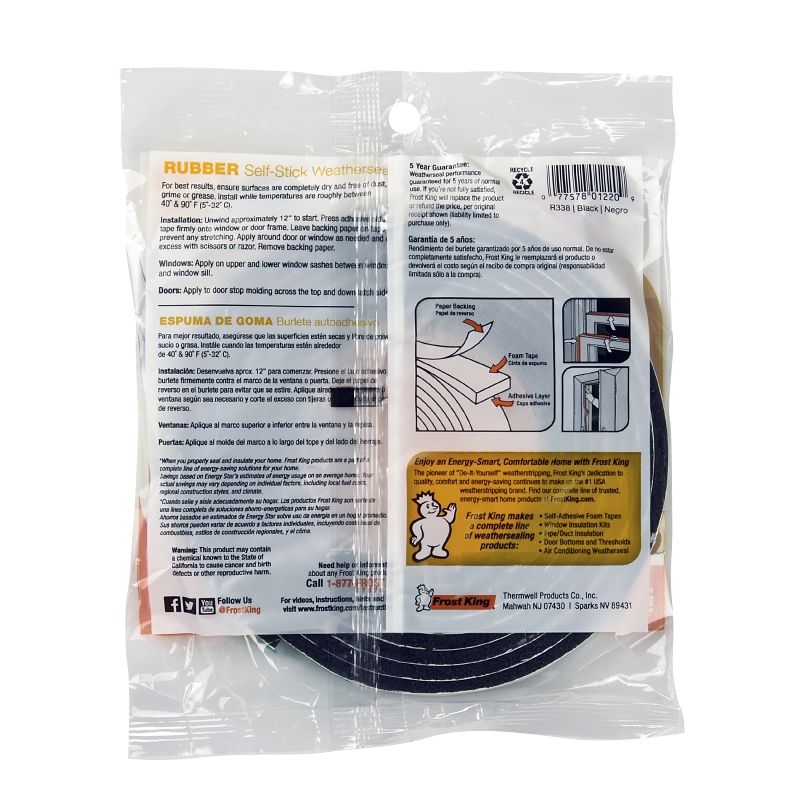 A tough, durable self-stick tape with minimal compression. Use the rubber foam weatherseal as a weatherstrip or as a gasket or to cushion and stabilize major appliances. Plus, on cars, trucks and boats, it can help prevent rattles, vibrations and squeaks.Item Specifications