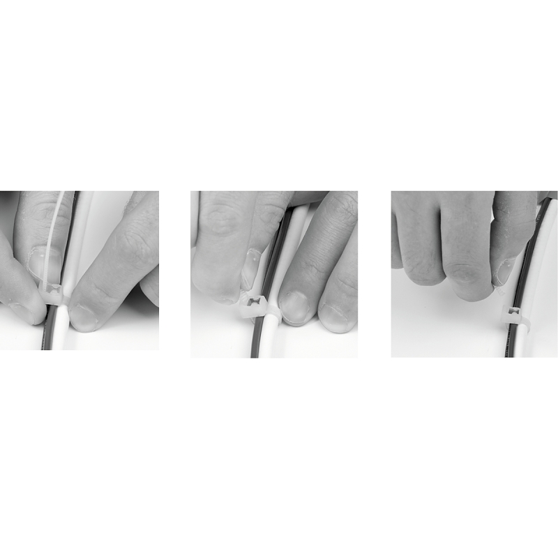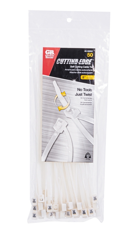 Save time and frustration using the latest innovation from Gardner® Bender; the self-cutting cable tie. Easy to use; simply lock-and-twist to finish the job, with no need for an additional cutting tool! Unlike other "twist" ties our patented design doesn't require a reduction in the strength and durability of the cable tie material or multiple rotations to achieve a break in the tie. Instead, a small cutting blade designed into the head of each tie ensures a tight lock and quick, clean cut, improving the appearance of the end result and virtually eliminating residual jagged edges which can bite into bare skin.Item Specifications