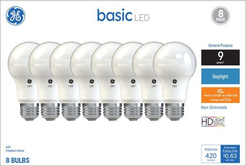 GE LED Light Bulb, Wattage Rating: 5.2 W, Lamp Base: E26 Medium Screw, Lamp Shape: A19, Lamp Finish: Diffuse, Lumens: 420 Lumens, Dimmable: No, Light Color: Daylight, Color Temperature: 5000 K, Color Rendering Index (CRI): 90, Average Life: 9.1 years, Dimensions: 4.37 in L, Incandescent Equivalent: 40 WItem Specifications