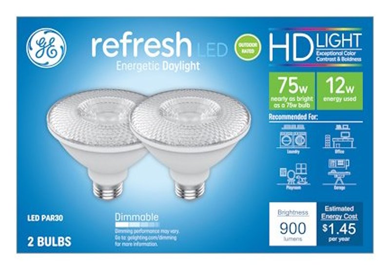 GE Industrial Solutions LED Bulb, Flood/Spotlight, Wattage Rating: 12 W, 120 V, Lamp Base: E26, Lamp Shape: PAR30, Lamp Finish: Clear, Lumens: 900 Lumens, Dimmable, Light Color: Daylight, Color Temperature: 5000 K, Color Rendering Index (CRI): 92, Average Life: 15,000 hr, Dimensions: 3.66 in L, Efficiency: 75 Lumens/W
