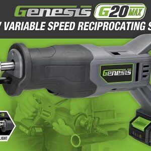 Genesis Variable Speed Reciprocating Saw, Tool Only/Battery Included: Battery Included, 20 V, 2 Ah Battery, 1 in Stroke Length, 0 to 2900 spm Strokes per Minute, Includes: Battery, Charger, (1) Wood-Cutting Blade and (1) Metal-Cutting Blade, Lithium-Ion BatteryItem Specifications