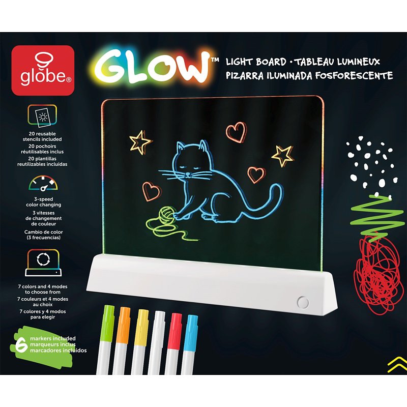 globe Glow Board, Specifications: Aqua/Blue/Green/Purple/Red/White/Yellow Light Color, Battery Power Type, Slow, Medium, Fast and Auto Modes, Plastic, Clear, Dimensions: 1.77 in L x 11.42 in W x 9.65 in H, Number of Pieces: 27, Includes: (20) Stencils and (6) Markers