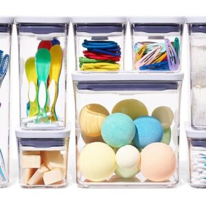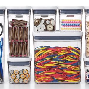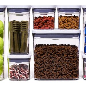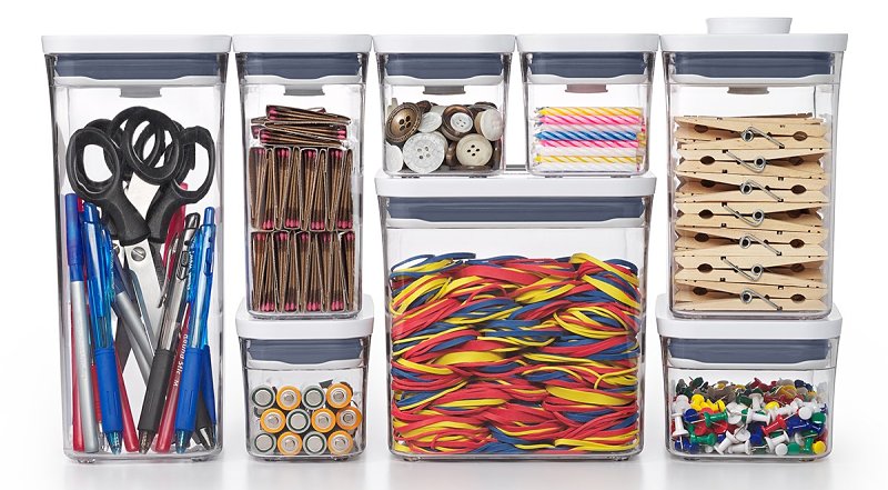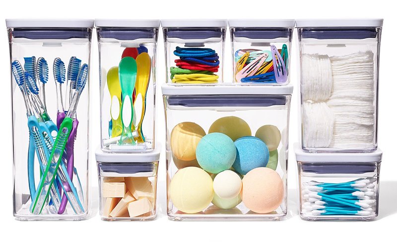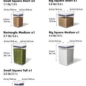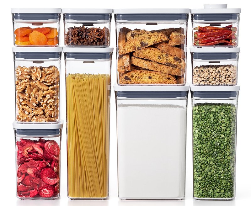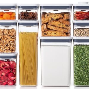 Need help managing kitchen chaos. We designed the OXO good grips 10 piece POP container to keep pantry staples fresh and organized. Airtight, stackable, space efficient and now completely dishwasher safe, these food storage containers can be customized to fit any space. New shapes and sizes provide new possibilities for storing everyday must haves like flour, sugar, coffee, cereal, oatmeal, coffee, grains, pasta and spices. With a handy fill line to guide you, curved corners for smooth dispensing and sturdy, BPA-free construction POP containers take tidying to the next level. POP containers aren't just for kitchens: use them any place you want more organization. For excellent results, always use the button to open and close. Do not carry POP containers by the lid.Item Specifications