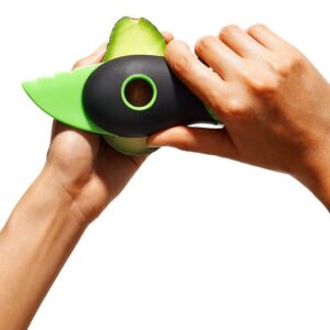 The plastic blade smoothly cuts through avocado skin and fruit, yet isn't sharp to the touch. The pitting tool quickly removes pits with a simple twist. The fan blade cuts fruit into ideal slices and scoops them out for serving.