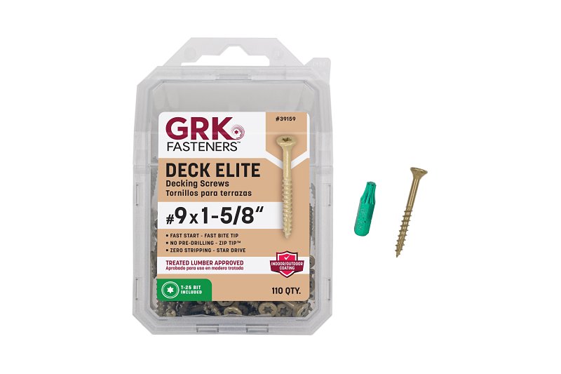 GRK's Deck Elite screws are designed for use in wood deck boards and provide a quick drive and clean finish. Deck Elite screws start immediately in wood with a smooth, fast drive to increase productivity on the job and the tan color of the screw provides an ideal finish.Item Specifications