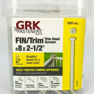 FIN/Trimâ⢠screws are an excellent choice for deck rails, exterior/interior trim, joining cabinets and most fine carpentry applications such as crown molding and window/door jambs. It leaves a clean look as the tiny heads disappear when countersunk. Available in #8 and #9 ga Dia in lengths from 1-1/4 to 5 in. Approved for use in all applications that include pressure treated lumber.