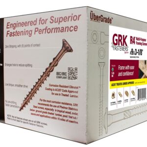 GRK Fasteners R4 Framing and Decking Screw, Thread Size: #9, 3-1/8 in L, Head Type: Round, Drive Type: Star, Steel, Package Quantity: 1900 BX, Multi-Purpose, Thread Length: 2.087 in, Drive Size: T-25, Applicable Materials: Cement, Fiber Board, Melamine, Particle Board, Plastic, Sheet Metal, WoodItem Specifications