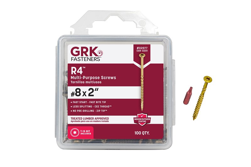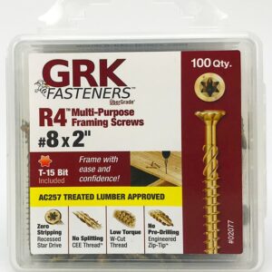 GRK Fasteners R4 Framing and Decking Screw, Thread Size: #8, 2 in L, Drive Type: Star, Steel, Package Quantity: 100 PK, Multi-Purpose, Thread Length: 1.29 in, Drive Size: T15, Applicable Materials: Cement Fiber Board, Melamine, Particle Board, Plastic, Sheet Metal, Wood